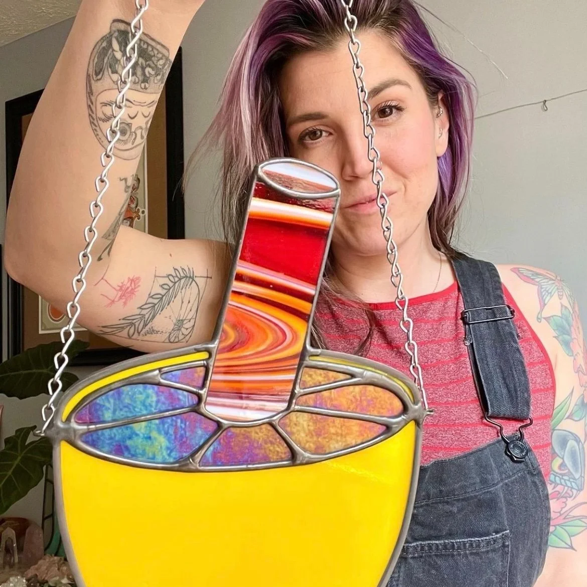 Sara specializes in modern stained glass design with tons of colors and texture. Her pieces have traveled into many homes all over the world, but especially in Baltimore where you can find many of her locally themed pieces such as the ever popular lemon stick.