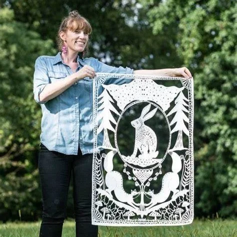 Annie Howe is a multimedia paper cut artist based in Baltimore, Maryland. Her intricate papercuts are used for a variety of projects including illustration, surface design, and more recently three-dimensional work. Annie has created work for numerous organizations and businesses including Anthropologie, T. Rowe Price, Neighborhood Design Center, Baltimore Office of Promotion & The Arts, and the University of Maryland Medical Center. With over 12 years of workshop teaching experience, Annie leads workshops for small groups, large groups, young and old, artists and non- artists.