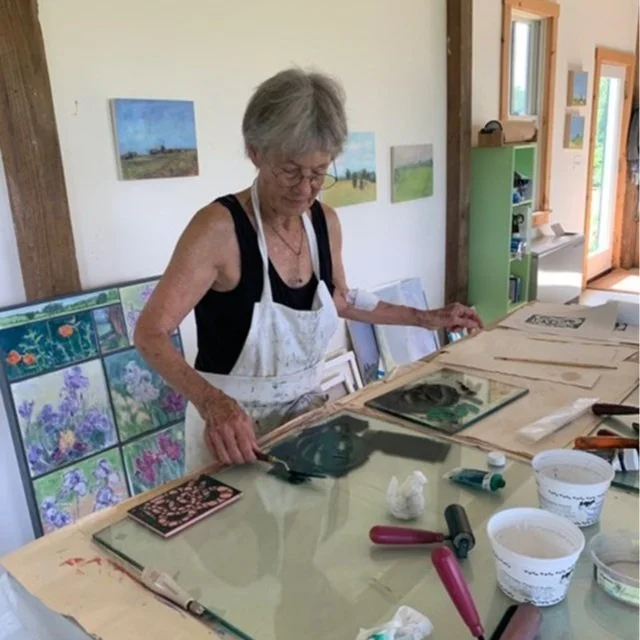 Mary Swann is a landscape painter, formerly a narrative quiltmaker, and recently a printmaker. She has spent most of her adult life somewhere in the countryside and now lives on a nearby farm with her husband, Josh Brumfield, a fine woodworker. Returning to school in the 1980’s, she received a BFA in Painting from MICA, only to return once more to take classes in Printmaking throughout the 2000’s. Her latest passion is color Reduction Blockprinting, which she is dying to share with anyone daring enough to take it on.