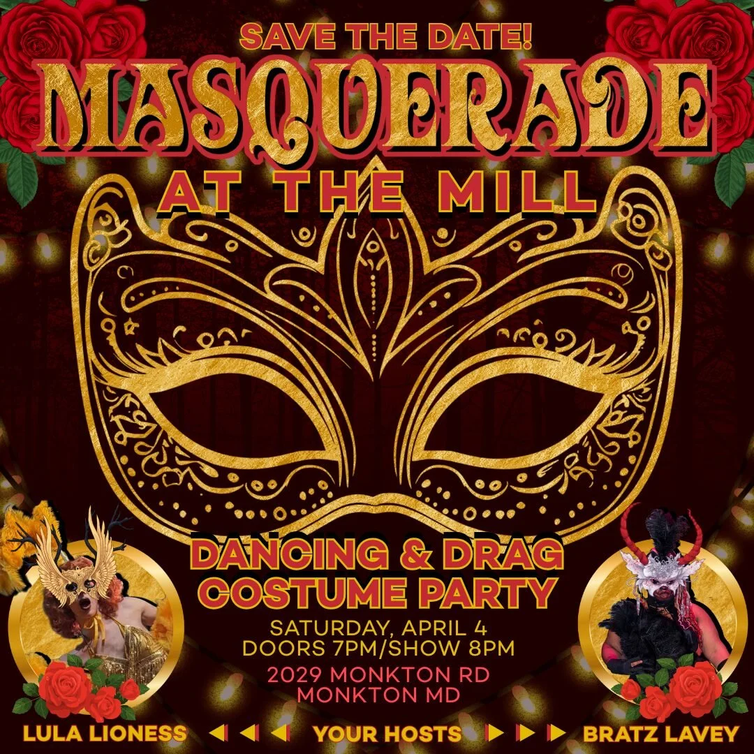 Mystery, glamour, and intrigue await you at the Masquerade at the Mill! Don a shimmering disguise, let loose on the dance floor, and be captivated by a dazzling drag show hosted by local Baltimore queens, Bratz Lavëy and Lula Lioness. We’ll have a costume contest with prizes for those who bring the drama.