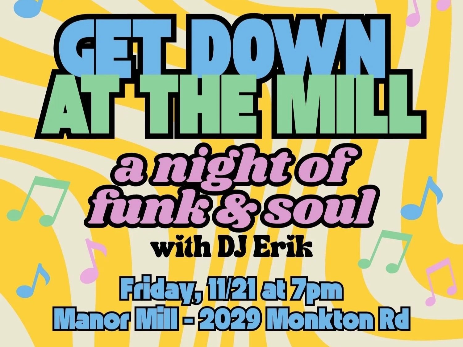 Join us on Friday, November 21 at Manor Mill for an evening of funk, soul, and groove-heavy vibes with DJ Erik. From classic cuts to deep tracks, DJ Erik spins the sounds that move your feet and lift your spirit.