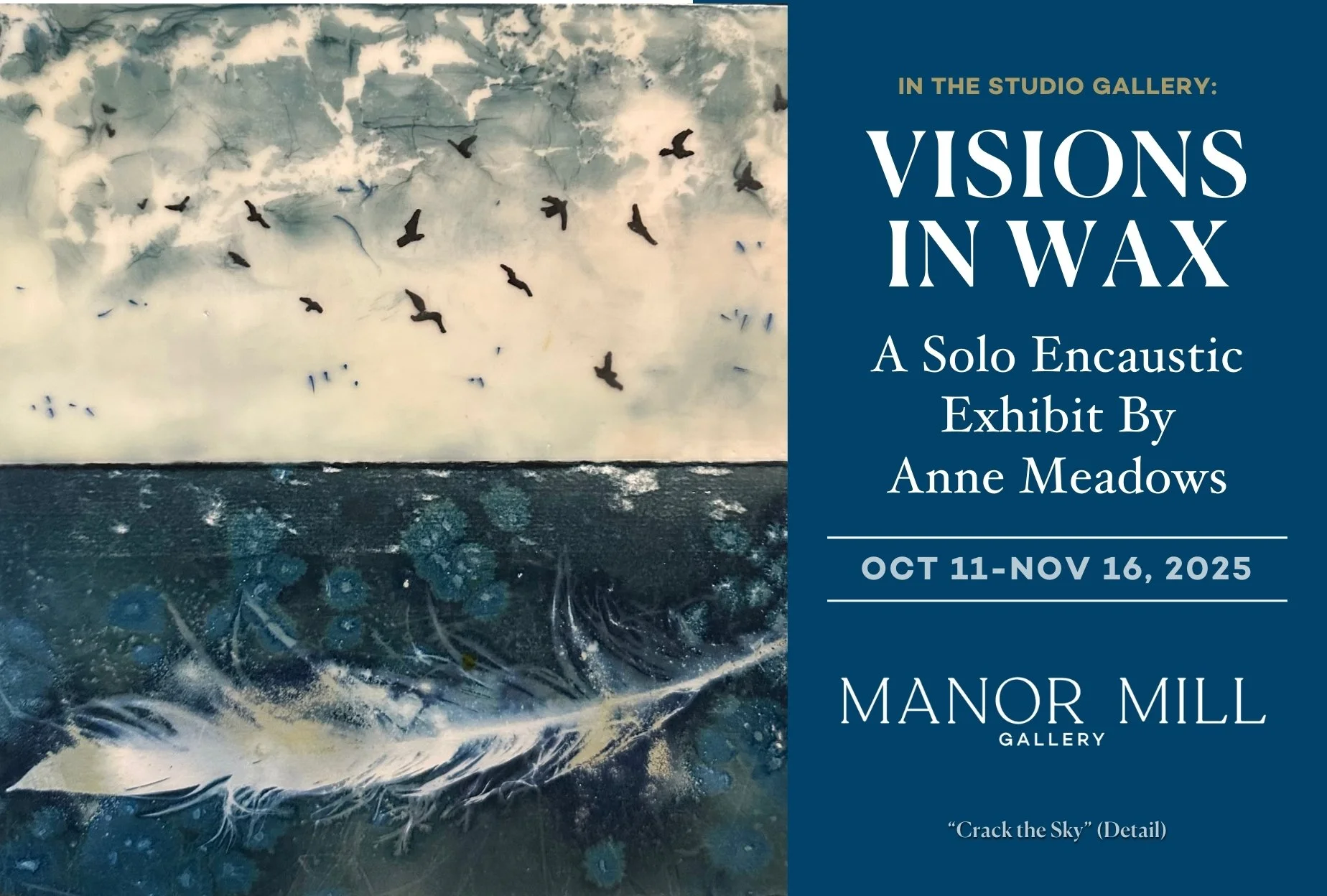 Manor Mill Gallery is excited to exhibit the engaging encaustic works by Maryland-based artist Anne Meadows. She is formally trained in a variety of art disciplines including painting, printmaking, ceramics, and photography. She started her studies at Virginia Commonwealth University and after moving to Maryland continued taking art classes at Towson University and MICA. She later graduated from the College of Notre Dame of Maryland with a masters degree in art education. After a career teaching art in the Marylands public school system she is now retired and maintains a studio practice in Monkton surrounded by her dogs and the nature that influences her work. She shows and sells her work and has collectors in the US and UK.